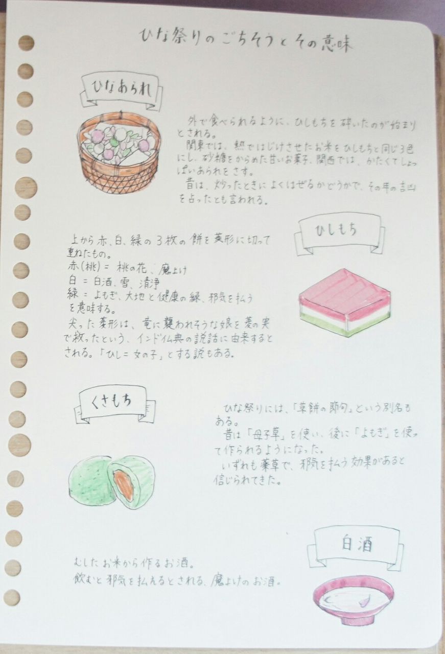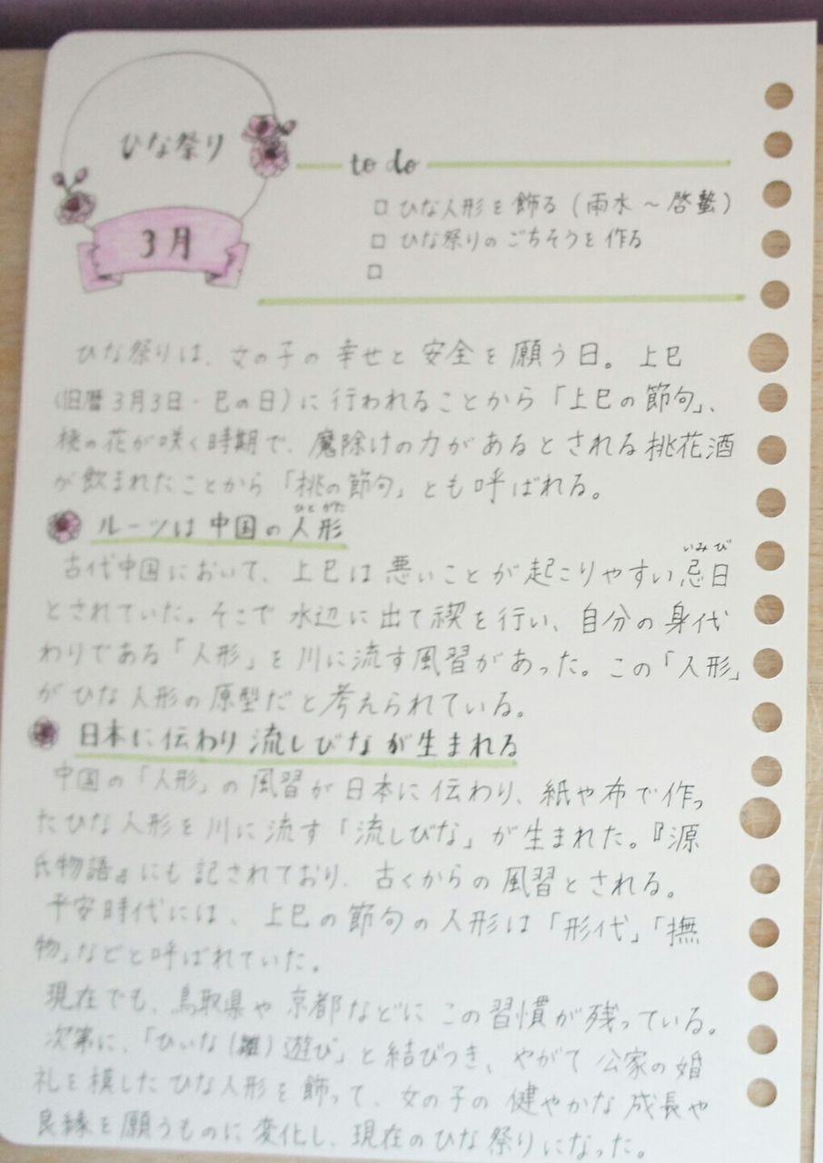 さて、最後に、昨年作っておいた歳時記ノートひな祭り編をご紹介します。これはひなまつりの由来や説明をまとめた「ジャーナル」の部分。