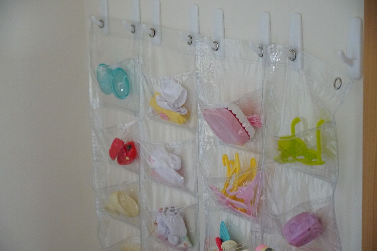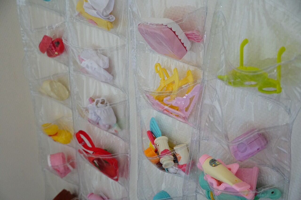 もっと小さい21ポケットタイプのものは、シルバニアやリカちゃんなどにも良さそう。ただし、壁に余裕がないとできないので、それがない場合は、こういうケースが便利です。